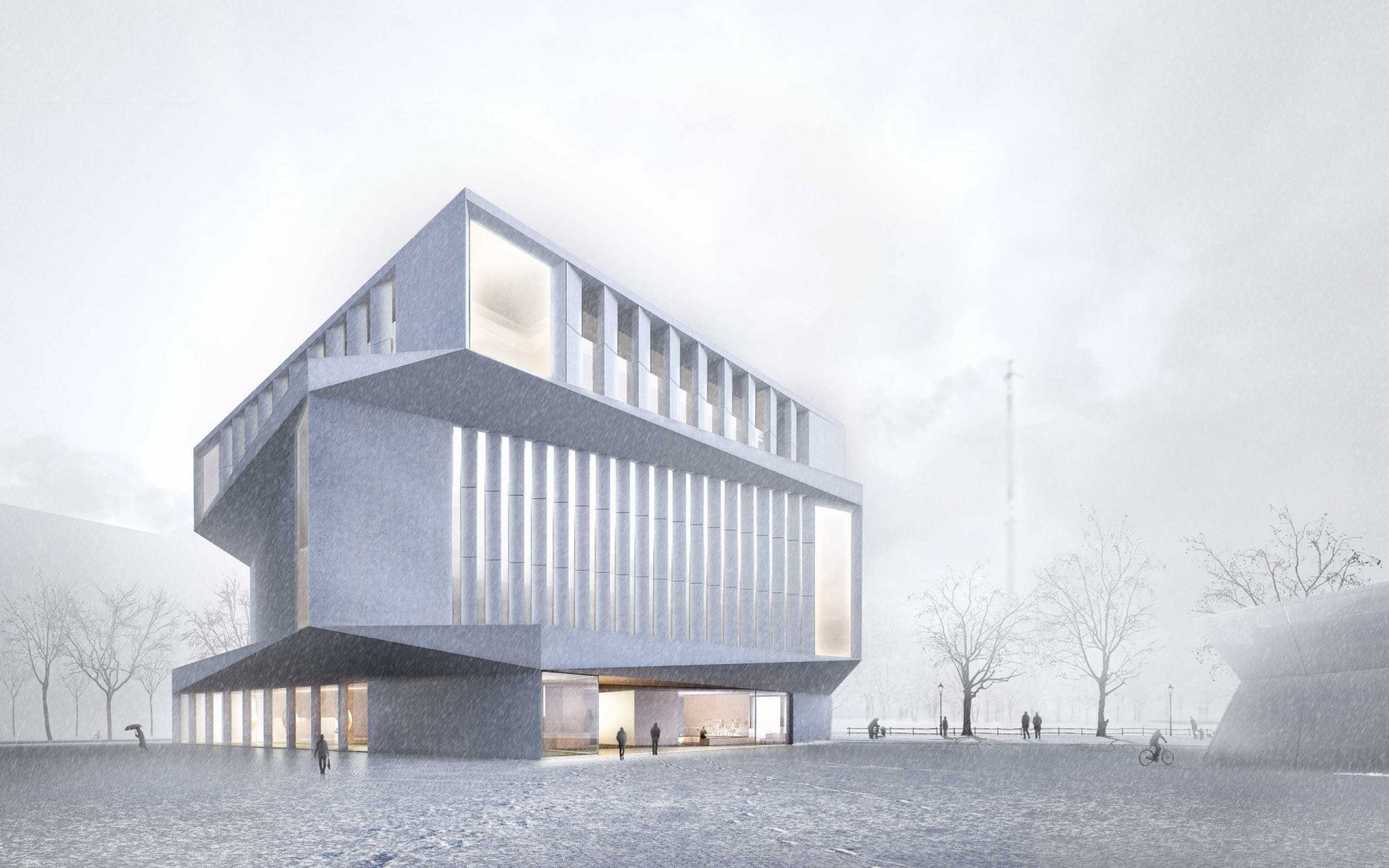 Dieses Grundstück verdient ein städtebauliches Merkmal am Ende des Kunst-Campus, das sowohl Attraktor und Abschluss für den Platz ist, als auch Ziel und eine Einladung in das Gebäude. Das vorgegebene Baufenster wird in seinen Dimensionen übernommen und vorgegebenen Höhen werden nur unwesentlich überschritten. Eine Transformation des Volumens ohne Flächenmaximierung in drei unterschiedlich ausgerichtete Teilkörper gibt dem Gebäude ein Gesicht und damit eine Hinwendung zum Platz: Die Architektur präsentiert sich und lädt ein, wird zum Ziel und weckt Sehnsüchte. Selbst dort, wo die Invalidenstraße den Spandauer Schifffahrtskanal überbrückt, wird das städtebauliche Merkmal deutlich. Das Erdgeschoss nimmt die Geometrie des Baufeldes auf, die drei Obergeschosse mit der Büronutzung wenden sich zum Kunstcampus, die beiden Dachgeschosse mit Wohn- oder auch Büronutzung orientieren sich an der Richtung des Kanals: Das Haus wird vollständig eins mit dem Ort.