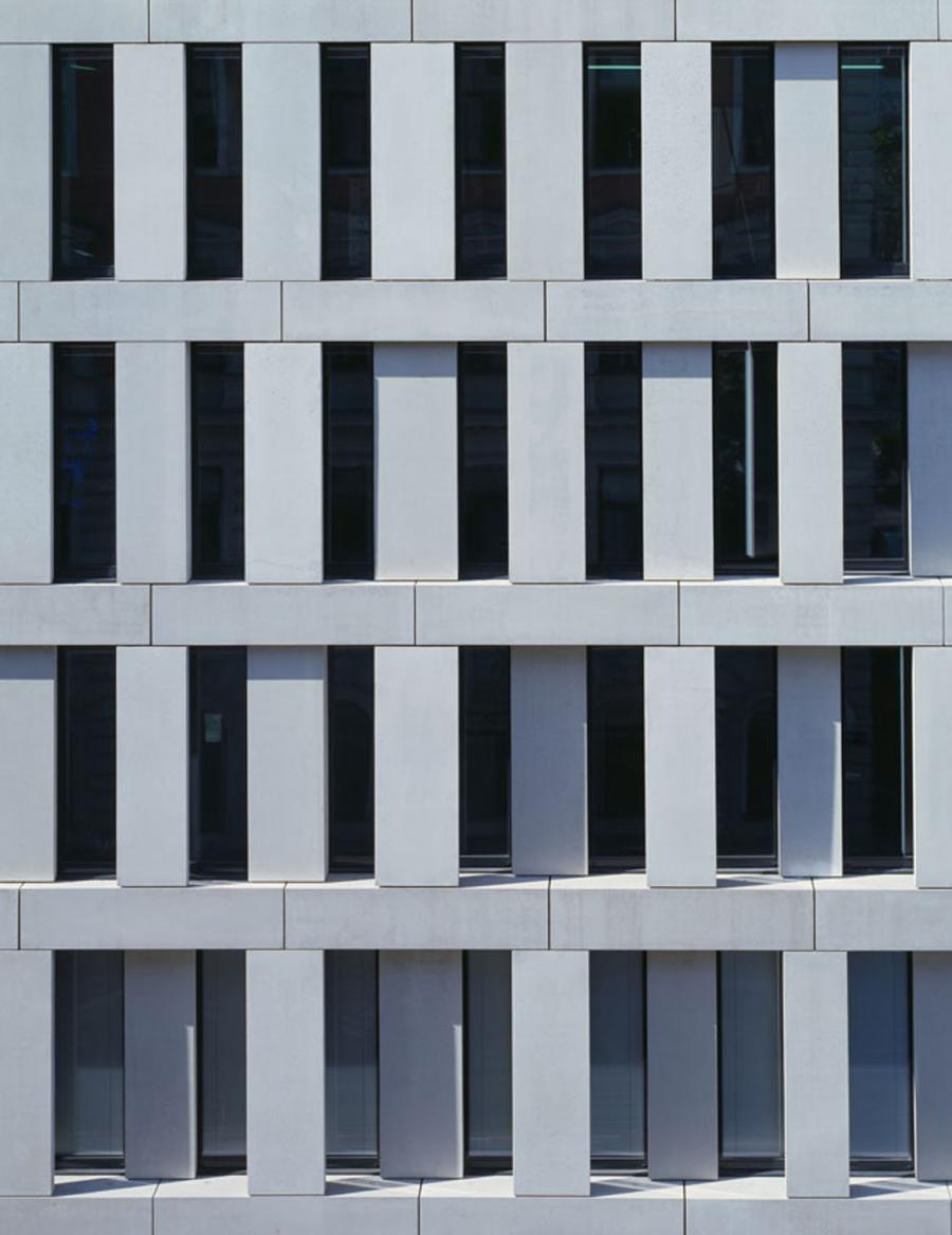 Von einer gläsernen Naht klar abgesetzt, fügt sich der Zubau harmonisch in den Block. Seine Fassade ist aus präzise verarbeitetem Sichtbeton, dem eine marmorierte Oberfläche die Anmutung von weißem Travertin gibt. Im Büro von Carsten Roth wurde dafür der Terminus „schalungsreiner Kunststein mit travertinartiger Oberfläche“ erfunden. Vor- und rückspringende Betonpfeiler in drei Tiefen und raumhohe Öffnungen von unterschiedlicher Breite transformieren die Plastizität der Gründerzeit in die Gegenwart. Ihre divergierende Größe macht in moderner Tradition den Kräfteverlauf spürbar. Denn die Masse dieser Kunststeinwand ist eine statisch optimierte, mehrgeschoßige, perforierte Scheibe, die von einem Vierendeelträger abgehängt an wenigen Auflagerpunkten in den Stahlbetondecken des Zubaus verankert ist. Optisch wirkt sie als lebendige Mittelzone der klassisch komponierten Fassade, während oben das zurückgesetzte, schrägverglaste Dachgeschoß als verbindende Klammer Alt und Neu umschließt. Nachts, wenn das Licht brennt, zieht es sich wie ein leuchtender Reif um den ganzen Block.