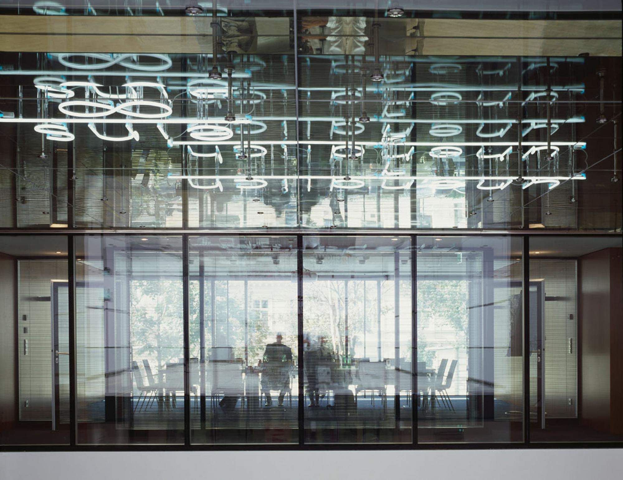 In der Kolingasse löst sich das gläserne Erdgeschoß gleichsam in Licht und Glas auf. Hinter dem Windfang öffnen zwei Schlitze den Blick quer durch das Haus und machen seine Dimensionen erlebbar. Die ganze Eingangsfront stützenfrei zu halten und die Fassade über dem transparenten Sockel schwebend wirken zu lassen, war eine herausragende Leistung des Büros Bollinger + Grohmann. Die Lasten werden auf Stahlbetonscheiben, die an den Seitenflanken hinter der Glasschicht liegen, abgeleitet. Auch die kirschholzverkleidete Wand im zweigeschoßigen Foyer trägt mit. Scheinbar unendlich spiegelt sich der Schriftzug „eins durch unendlich – unendlich durch eins“ von Brigitte Kowanz im schwarzen Glas an der Decke. Eine Stiegenkaskade mit Podest und eine Brücke zur Konferenzraumspange im ersten Stock machen aus der Notwendigkeit, die Garageneinfahrt zu überbrücken, ein räumliches Erlebnis. Um eine Ebene angehoben, entfaltet dahinter das Atrium seine faszinierende Wirkung. Es mündet in eine lichte, großzügige Kantine. Alle Büros im Zubau haben zweiteilige, öffenbare Verbundfenster mit schwarzen Alurahmen und Jalousien in der Mitte, die Betondecken sind unterseitig mit einer Kapillarkühldecke ausgerüstet und geputzt, es gibt kontrollierte Be- und Entlüftung. Glasschwerter rhythmisieren die Transparenz im sechsten Stock, nehmen so die Fassadengliederung auf und bieten Panoramablicke im Cinemascope-Format. Über der kunststeinernen Attika, deren Höhe sich an die Gesimskante des Bestands hält, kann man sogar auf einen Balkon treten. In diesem Haus ist selbst die Tiefgarage mit ihren 140 Stellplätzen besonders. Jeder Mitarbeiter nannte drei Lieblingsbücher, die Fotos ihrer Rücken machen das Parkdeck mit der froschgrünen Decke und dem hellen Gussasphalt zur symbolischen Bibliothek: ein literarisches Porträt der Menschen, die hier parken.“