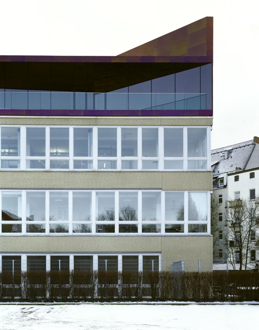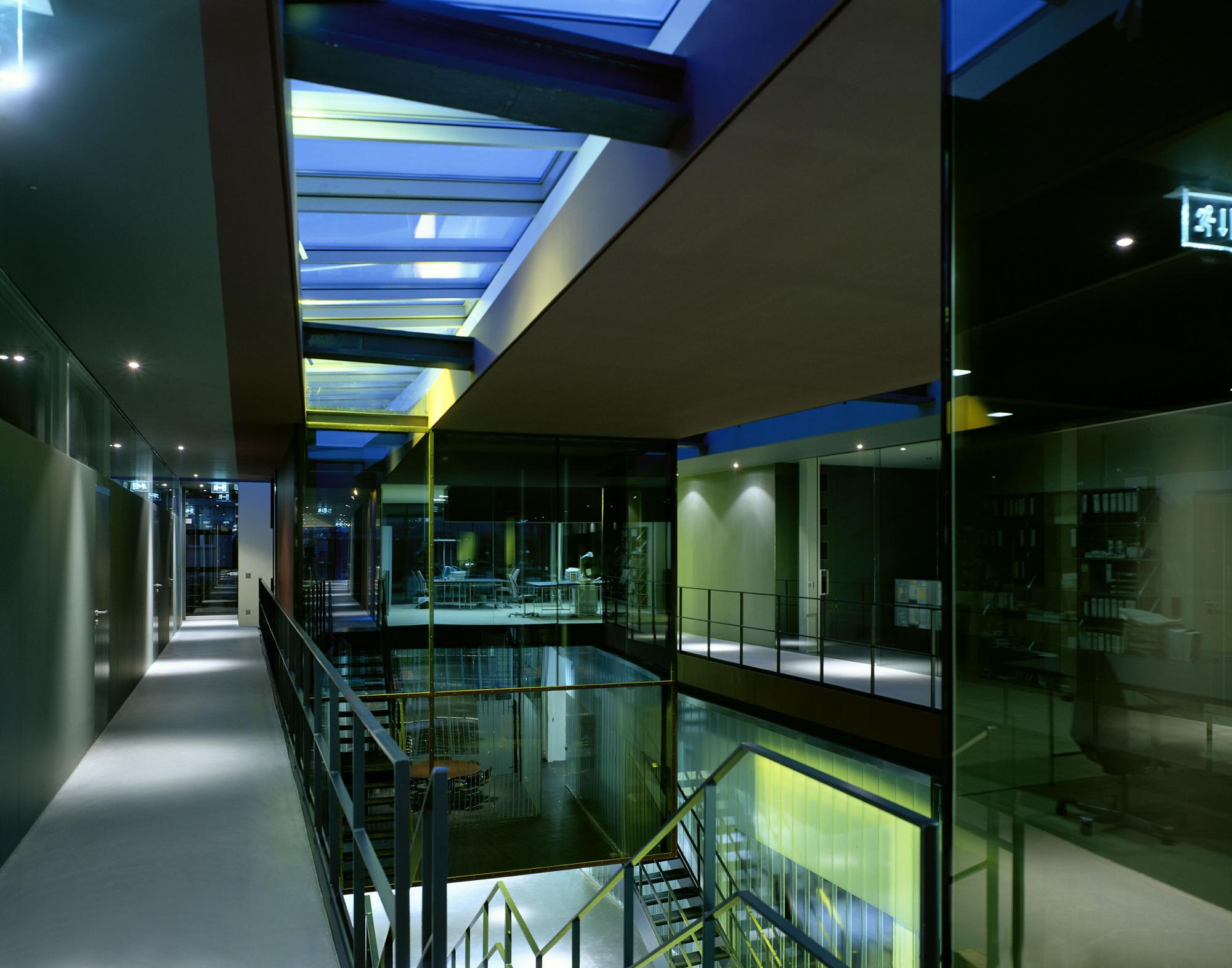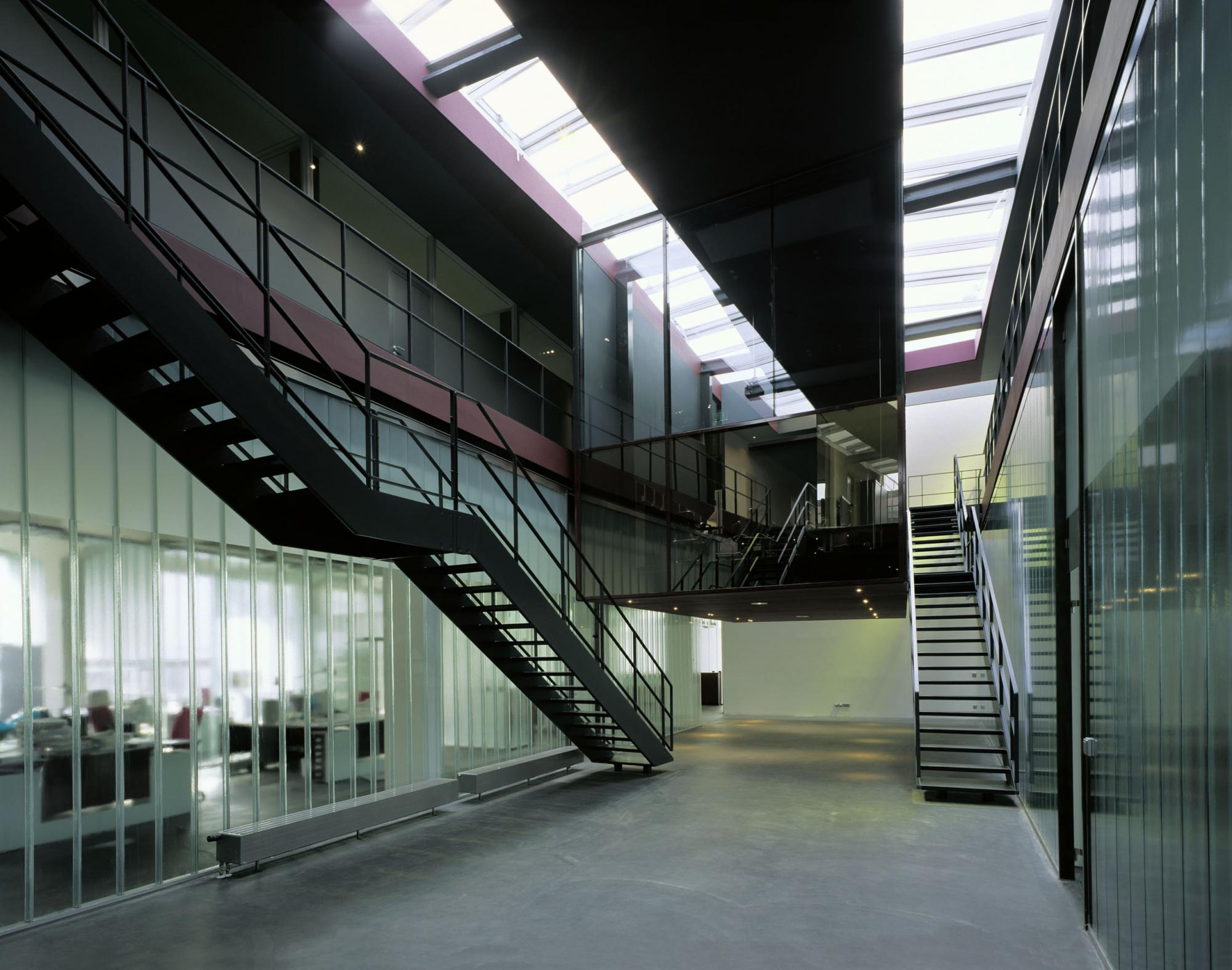 Überraschend ist, dass die Architektur von Carsten Roth zwar unkonventionell, aber keineswegs spektakulär ist. Viele Elemente nimmt man erst auf den zweiten Blick wahr – von dem aber kann sich der Betrachter so schnell nicht lösen. Moment mal, stimmt das? Wer täuscht hier wen? Roth versteht das Spiel großartig, durch Irritation der Sehgewohnheiten Signifikanz zu erreichen. Im Fall Waterloohain 5, dem zuerst fertig gestellten Haus, gelang ihm dies mit einer ungewöhnlichen Aufstockung. Dem dreigeschossigen Gewerbebau aus den späten fünfziger Jahren setzte er einen autonomen Neubau auf, der durch einen hohen Grad an Abstraktion seine Körperlichkeit fast schon wieder verliert. Das Ganze spielt sich zwischen einer Boden- und Deckenplatte ab, deren Maße (60 x 25 m) sich an der behäbig breiten, ehemaligen Produktionsstätte orientieren, allerdings an der Nordseite über den Giebel hinausragen. Die weitestgehend verglaste Fassade tut dies genau nicht. Ihre Richtungen leiten sich jeweils aus der unmittelbaren Umgebung ab: Straßen- und Gebäudefluchten und Blickbeziehungen bestimmen den Verlauf. Das allein aber führt noch nicht zum gewünschten Erfolg. Erst in Verbindung mit der Oberflächenbehandlung weniger Materialien entstehen unter Licht- und Schattenwirkung die Brüche und Verzerrungen, die optischen Täuschungen gleichkommen. Transparentes Glas stößt auf pinkfarbig verspiegeltes Glas, ebenso wie mattes und poliertes Edelstahlblech auf gelochtes und polyspektral beschichtetes in schillernden Rottönen trifft. Darüber hinaus tut das Wetter ein Übriges. Regen erzeugt zusätzliche Effekte, während Sonne die Farben regelrecht zum Glühen bringt. Der verklinkerte Unterbau trägt seinen „neuen Hut“ mit großer Würde. Obwohl die hellgelben Riemchen als das wohl scheußlichste Fassadenmaterial aus dieser Zeit gelten, hat Carsten Roth daran nichts geändert. Ihm gefallen die denkbar klaren Formen der scheinbar einfachen und rein funktionalen Gewerbebauten der sechziger Jahre – außerdem waren keinerlei Baumängel festzustellen. Ein Problem stellte allerdings die produktions-technisch bedingte, ungewöhnliche Tiefe des Gebäudes dar. So wenig sich der „Bauch“ auch für Büronutzung eignete, für Besprechungsräume, Denkzellen, geheimnisumwitterte „Black Boxes“ bot er sich geradezu an. Selbst ein kleines Atrium zum frische Luft schnappen hat hier noch Platz gefunden. Dank der rigorosen Anwendung der „Betonsäge“ ist es dem Architekten nicht nur gelungen, die beiden oberen Geschosse miteinander zu verzahnen, sondern auch viel Tageslicht von oben hereinzuholen. Die transluzenten Trennwände der Arbeitsbereiche sorgen zusätzlich für Helligkeit von der Seite. Diese subtil mattierten Profilglasscheiben führen in ihrer Schichtung und Überlagerung zu diffusen Raumeindrücken, die das Spiel mit der Verunklarung weiter fortschreiben. Auch im Inneren gibt die unmittelbare Umgebung die Richtungen für den Deckenausschnitt, Treppenläufe und die Wände vor. Selbst die Anstriche folgen diesem Prinzip. So kommt es schon vor, dass mitten in der Deckenuntersicht zwei Farben unvermittelt aufeinander stoßen. Folgt man ihrer Linienführung, wird der Bezug schnell ersichtlich.