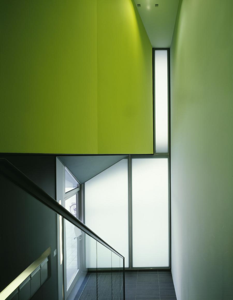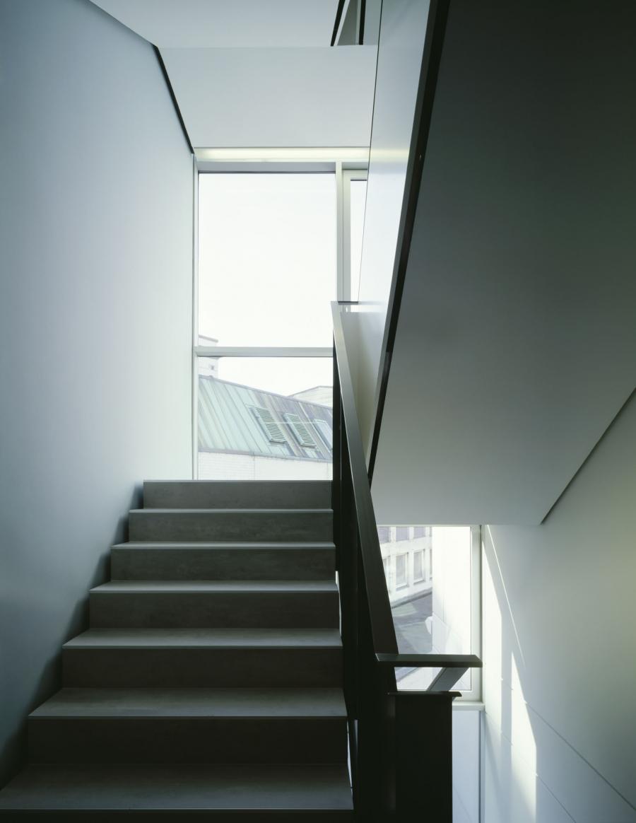 The cladding material is a coated glass specially developed for this purpose. Although the building is quite transparent on the inside, it appears heavy and solid on the outside, consistent with the surrounding stone. In addition the design elements mirror and reinterpret the grammar of their historic counterparts. The façade, for example, is classically articulated, with a base, middle, and attic floor. We also reinterpreted the bay window that was typical of the 19th century.