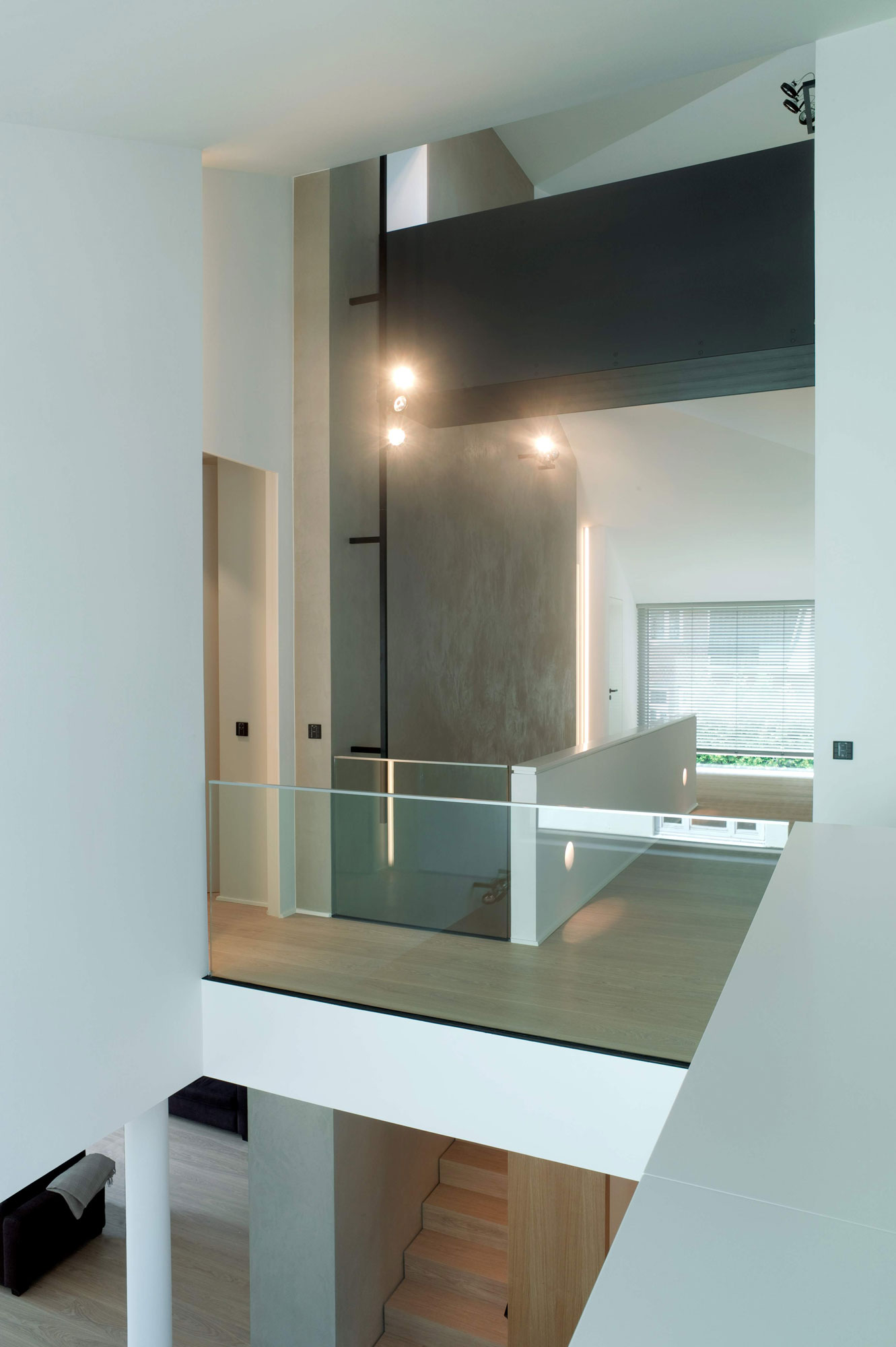 Single-family houses have always been classic fields of experimentation for architects in order to sound out room ideas that are not possible in other locations. The Villa WP15 plays with a spectacular interior, which circles around a chimney core from the basement of the hillside building to the highest point of the roof. The spatial continuum reaches a height of 12 m from the lowest to the highest point. A straight, multi-storey staircase and two short bridges structure this dramatic space. Two large, opposite windows in the upper floor hall open once to the east and west and let the morning and evening light fall deep into the room. An clerestory fills the complex cut airspace with changing plays of light and shadow.