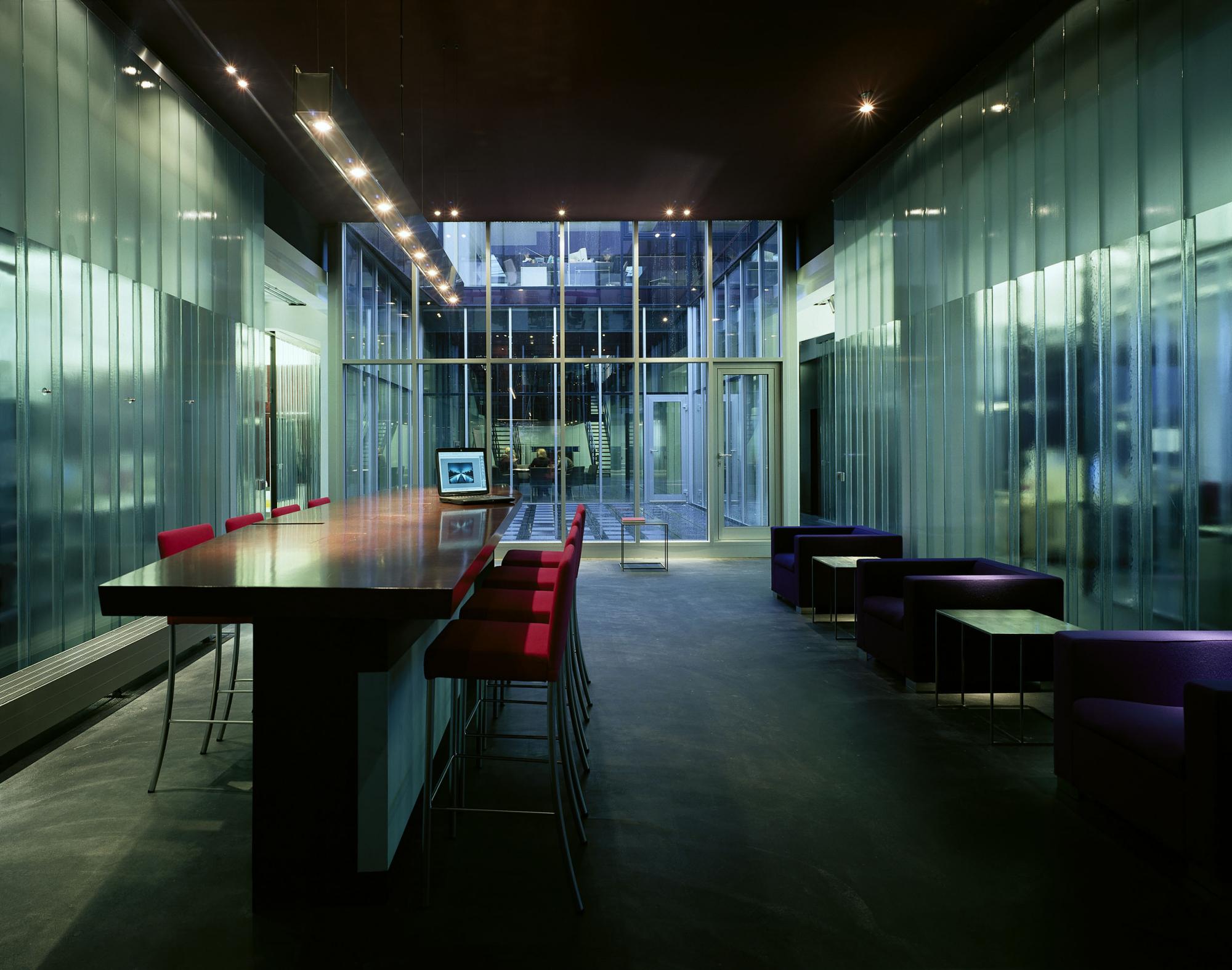 This built virtual space is anchored with the ‘white box’ where business clients are shown ‘what’ the company does. Its contrary is the ‘black box’ – a suspended ‘Thinking Cube’ full of spatial reflections – concealing ‘how’ the media people create their ideas. The innovation is a tangible virtual space that becomes a familiar home for various media teams and customers, making it a place that stretches through urbanity into endless spatial possibilities. The internal organisation is leaner and, therefore, more cost effective and inspiring than the previous facilities. The motivational effect of the architecture can be measured by the increased productivity reflected by the voluntary overtime hours spent in the office per week. The translucent/semi-transparent glass walls have the advantage of defining the space into comfortable units, and at the same time, keeping the whole floor spacious, open and bright. Consequently, space is readable as the architectural manifestation of the idea of communication.